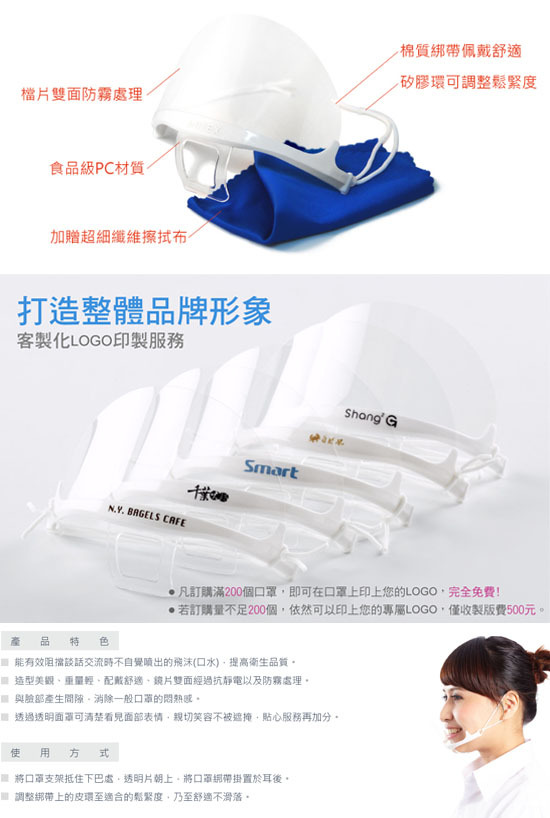 有別於一般口罩,透明口罩為環保PC材質,外型美觀大方,臉部表情不